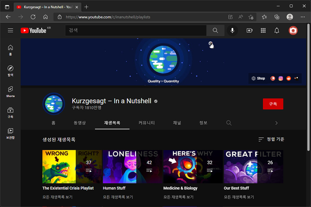 쿠르츠게작트(Kurzgesagt)의 채널은 아래의 링크를 통해서 확인할 수 있는데요. 대부분의 내용은 과학에 기반을 두고 있고 제작 관심이 많은 우주에 관련된 내용도 많은 편입니다. 그리고 독일인들에 의해서 제작되고 있지만, 영문으로 해설이 나오고 한국어 자막도 대부분(일부는 제외) 지원하기 때문에 어렵지 않게 시청할 수 있습니다.