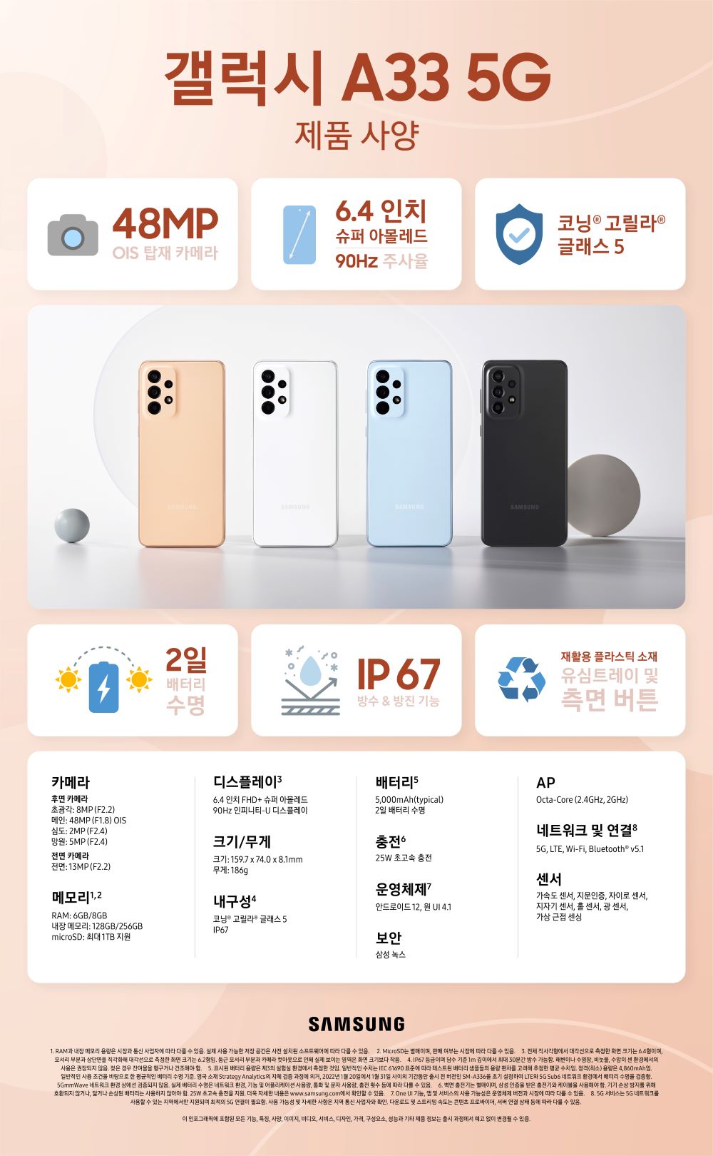 갤럭시 A33 5G의 특징을 인포그래픽으로 확인해보면 48MP OIS 탑재 카메라가 내장되었습니다. 그리고 6.4인치 슈퍼 아몰레드 90Hz 주사율 지원 디스플레이와 코닝 고릴라 글래스 5가 탑재되었습니다. 특히 중보급형 스마트폰에서는 찾기 힘든 IP67 등급의 방수 & 방진 기능을 지원한다는 점이 차별호된 특징입니다.