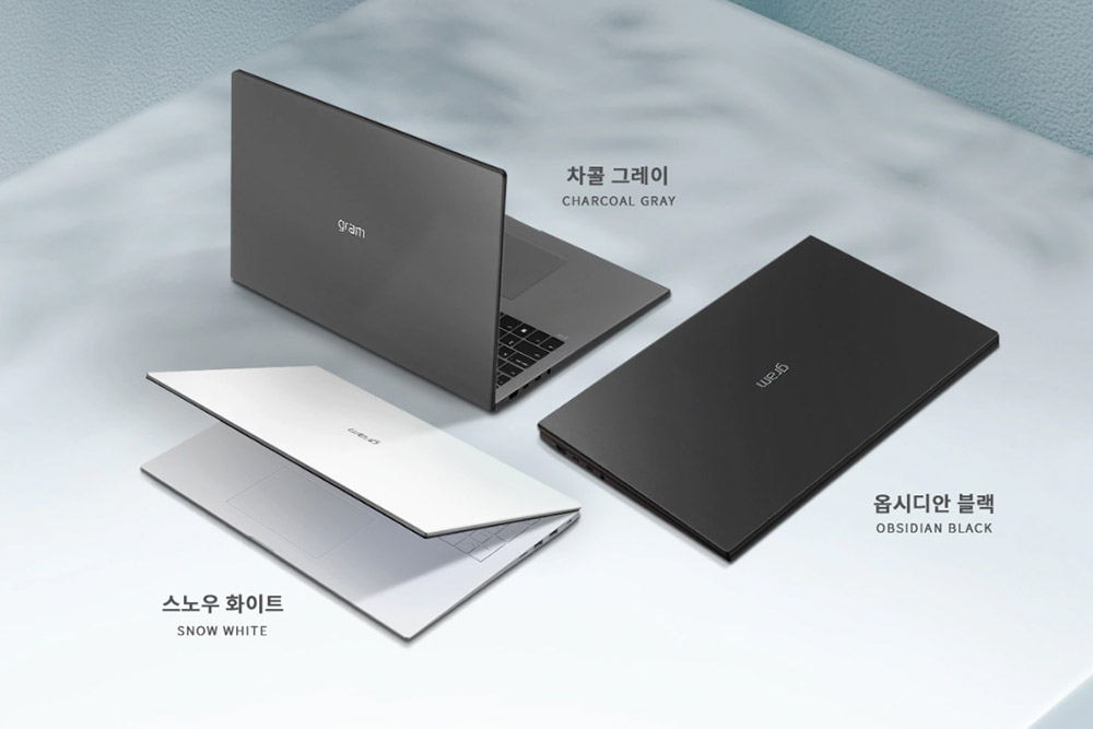 LG 그램 2022의 색상은 옵시디안블랙과 스노우화이트 그리고 차콜그레이 3가지로 출시되었습니다. 모두 무난한 느낌을 주기 때문에 대학생이나 직장인들이 사용해도 크게 부담스럽지 않으리라고 예상합니다. 참고로 LG 그램 16의 무게는 1.285kg이고 LG 그램 17의 무게는 1.435kg입니다.