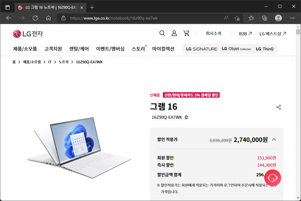 LG 그램 16(16Z90Q-EA7WK)과 LG 그램 17(17Z90Q-EA7WK)의 가격은 각각 2,740,000원(할인 적용가), 2,840,000원(할인 적용가)로 책정되었습니다. 출시 초기 때문에 저렴하다고 이야기하기는 어렵고 나중에 빅스마일데이와 같은 할인 기간을 노려보아야 할 것 같습니다.
