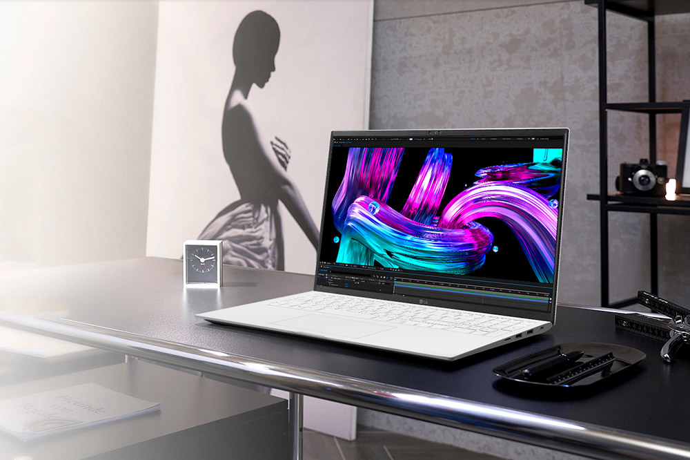 LG 그램 16(16Z90Q-EA7WK)과 LG 그램 17(17Z90Q-EA7WK)에는 각각 16인치(40.6cm)와 17인치(43.1cm) IPS 디스플레이가 탑재되었습니다. 16:10의 화면비와 WQXGA(2560 x 1600) 초고해상도를 지원한다는 특징이 있습니다. 그리고 위쪽에는 윈도우 헬로우를 지원하는 IR 카메라가 탑재되었습니다.