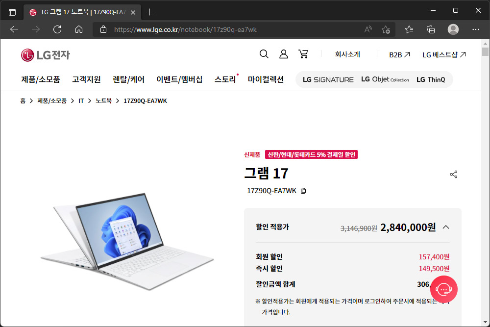 LG 그램 16(16Z90Q-EA7WK)과 LG 그램 17(17Z90Q-EA7WK)의 가격은 각각 2,740,000원(할인 적용가), 2,840,000원(할인 적용가)로 책정되었습니다. 출시 초기 때문에 저렴하다고 이야기하기는 어렵고 나중에 빅스마일데이와 같은 할인 기간을 노려보아야 할 것 같습니다.
