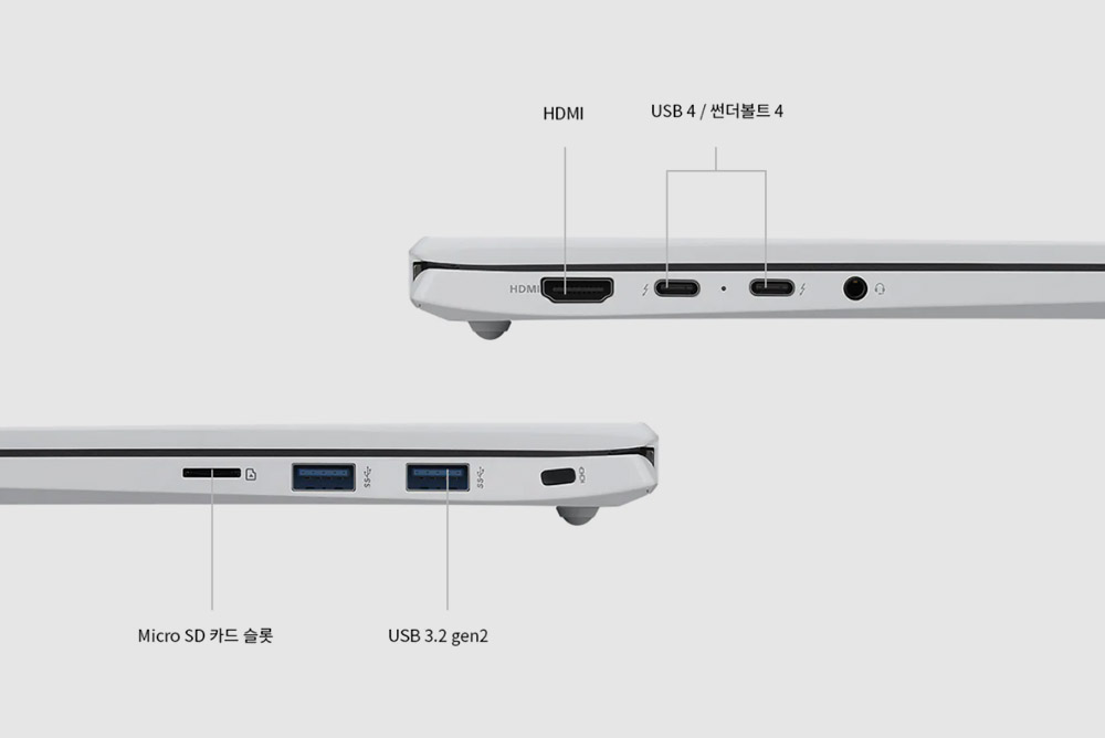 LG 그램 2022의 입출력 포트를 확인해 보면 HDMI와 2개의 썬더볼트4 그리고 역시 2개의 USB 3.2 gen2, 마이크로SD 카드 슬롯으로 구성되어 있습니다. 확장성은 무난한 편이라고 할 수 있습니다.