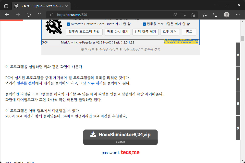 다운로드를 선택하면 HoaxEliminator6.24 라는 압축파일을 내려받을 수 있습니다. 그리고 암호가 걸려있는데요. 비밀번호는 teus.me이고 폴더를 확인해 보면 x64와 x86로 구분되어 있는데요. 보통은 x64를 선택해주면 됩니다. (자신의 사용하고 있는 윈도우의 버전이 32비트인지 64비트인지 확인해 보시길 바랍니다.)