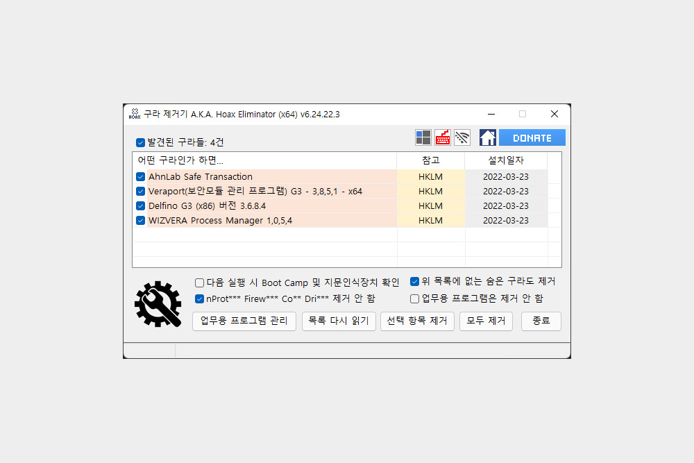 구라제저기를 실행시키면 현재 자신의 컴퓨터에 설치되어 있는 PC 뱅킹 관련 보안 프로그램들의 리스트가 표시됩니다. 만약 지속해서 사용한다면 제거할 필요는 없겠지만 컴퓨터에 문제가 생기고 느려지는 현상이 느껴진다면 해당 소프트웨어를 삭제하는 것을 추천합니다.