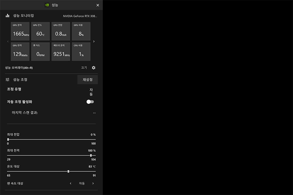성능을 선택하면 자신의 컴퓨터에 설치된 그래픽카드의 GPU 클럭과 온도 그리고 전압 등을 확인할 수 있습니다. 별도의 모니터링 프로그램을 설치하지 않고 간단하게 관련 내용을 확인할 수 있는 특징이 있습니다.