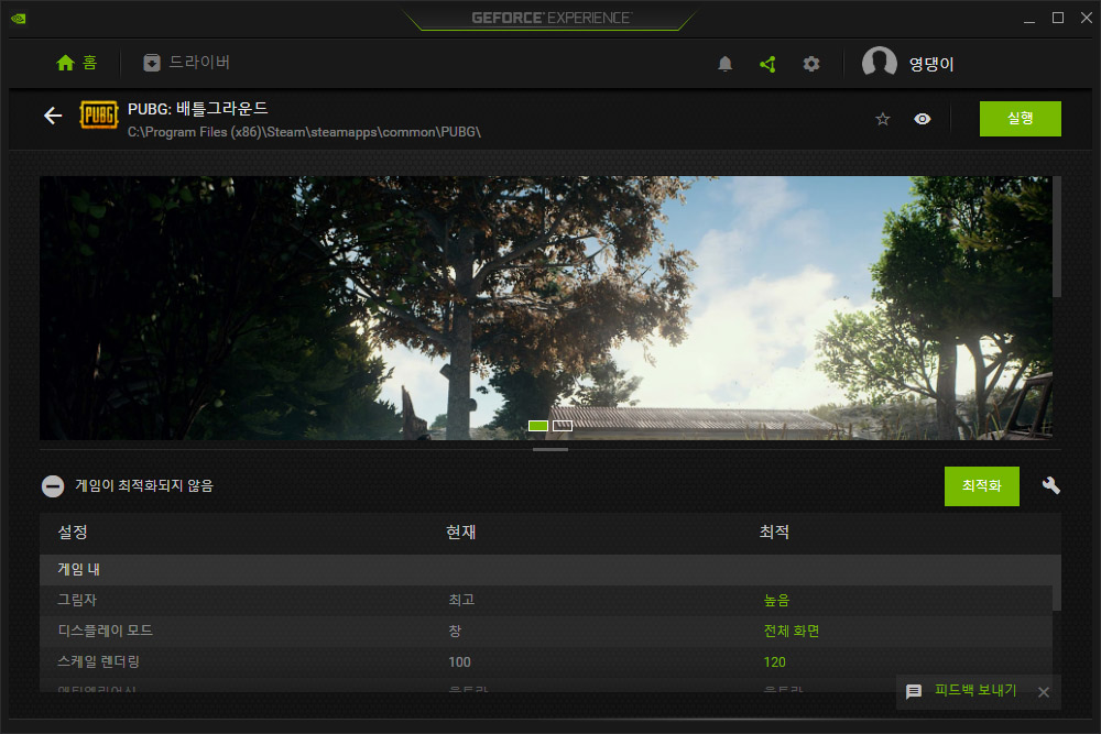 지포스 익스피리언스(GeForce Experience)의 재미있는 기능 중의 하나는 설치되어 있는 게임들의 옵션을 자동으로 최적화할 수 있는 기능을 제공한다는 점입니다. 게임에 대한 지식이 부족한 분들은 최적으로 설정하는 것을 추천하고 게임에 대한 지식 있는 분들은 수동으로 세팅하는 것이 좋을 것 같습니다.