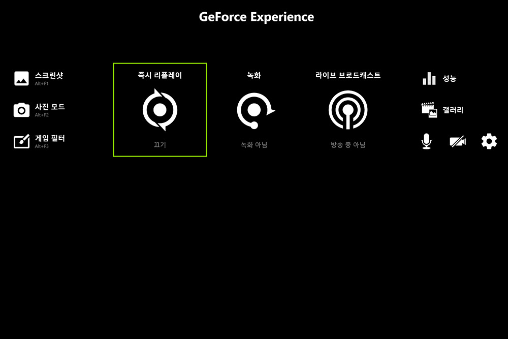 그리고 지포스 익스피리언스(GeForce Experience)에서는 게임 화면을 녹화할 수 있는 기능도 제공합니다. 단축키 Alt + Z키를 이용해서 동작시켜 줄 수 있고 Alt + F1은 스크린샷, Alt + F2는 사진 모드 그리고 Alt + F3는 게임 필터입니다. 그리고 가장 중요한 녹화 기능은 Alt + F9을 이용해서 동작시켜줄 수 있습니다.