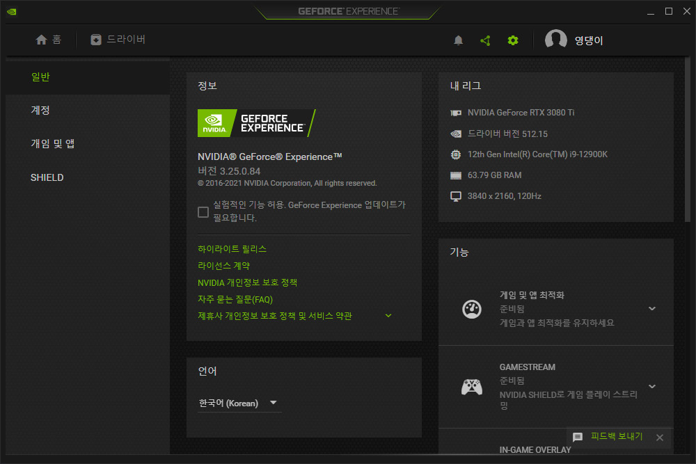 지포스 익스피리언스(GeForce Experience)의 설정에서는 언어를 변경하거나 현재 상태 등을 확인할 수 있습니다. 그 외에도 다양한 옵션들이 준비되어 있으니 필요에 따라서 활용해 주시길 바랍니다.