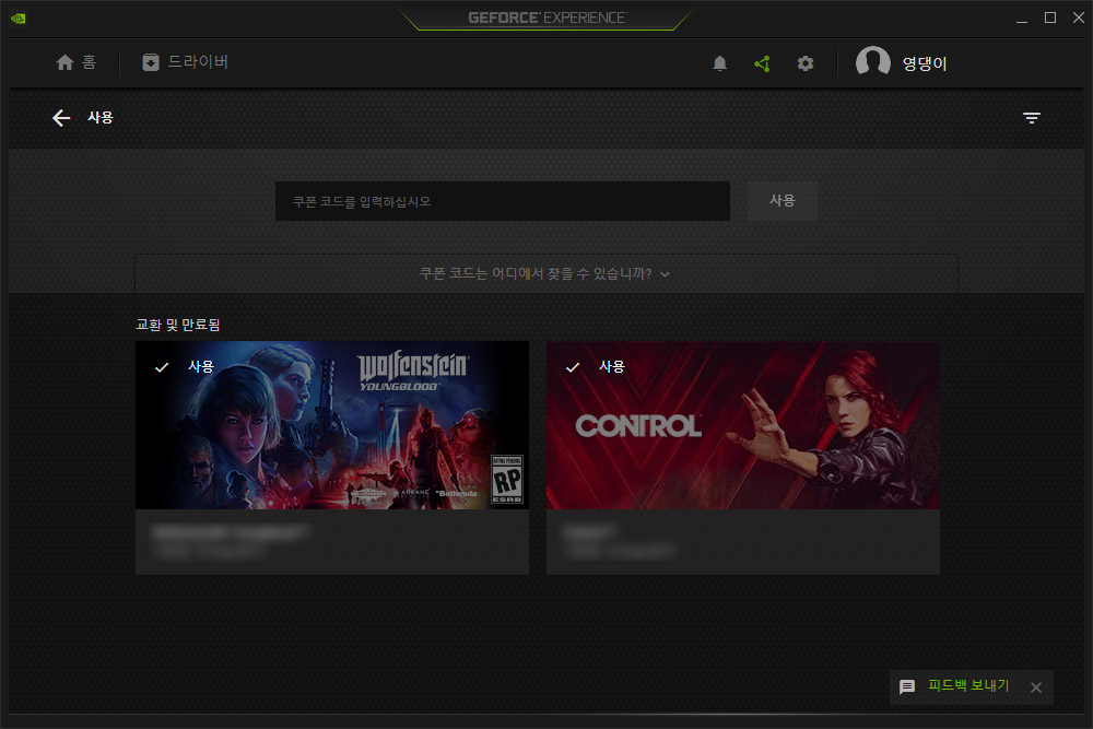엔비디아의 그래픽카드를 구매할 때 가끔 게임들의 리딤 코드가 제공되는 경우가 있습니다. 저도 몇 종류 받아보았는데요. 지포스 익스피리언스(GeForce Experience)에서 쿠폰 코드를 등록할 수 있습니다.