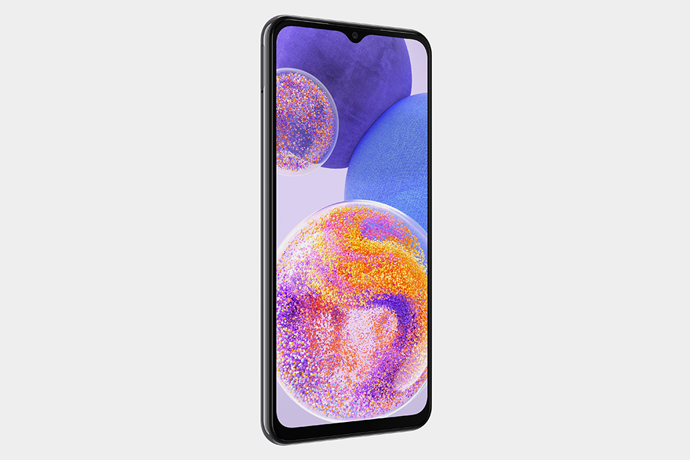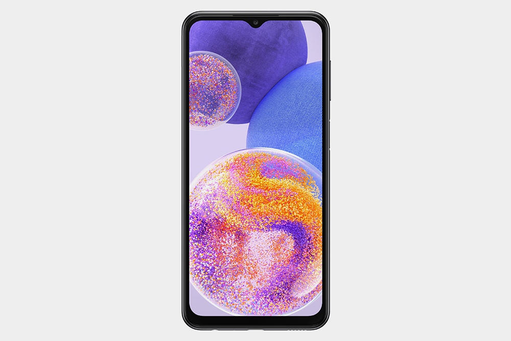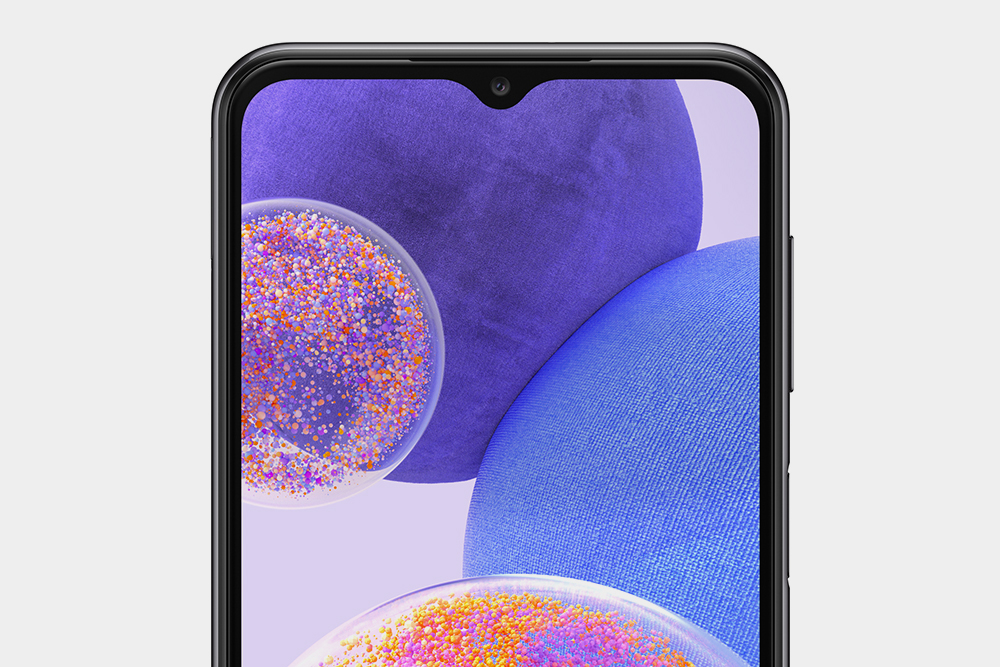 삼성 갤럭시 A23에는 6.6인치 FHD+(1080 x 2408) 해상도의 90Hz 지원 TFT LCD가 탑재되었습니다. V-CUT 노치 디자인이 적용되었고 800만 화소(F2.2)의 전면 카메라가 배치되어 있습니다. 중보급형 스마트폰이라서 베젤의 두께가 얇은 편은 아니고 상하좌우가 일치하지도 않습니다.