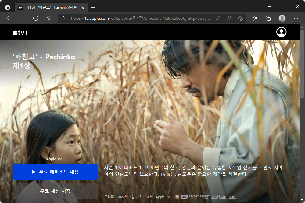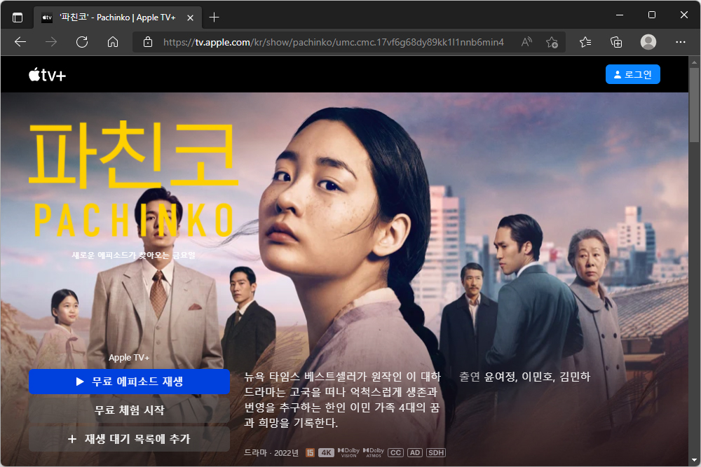 파친코(Pachinko) 애플 홈페이지에서 에피소드1화를 선택하면 무료 에피소드 재생이라는 메뉴가 준비된 것을 확인할 수 있습니다. 참고로 애플 아이디가 있어야 시청을 할 수 있습니다.
