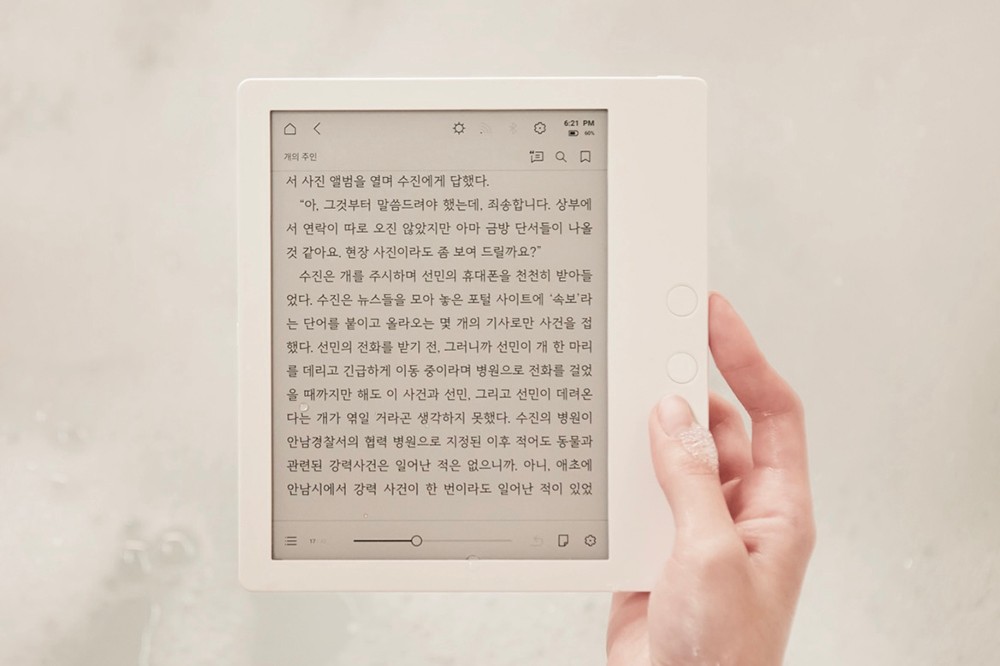 전자책 단말기가 일반적인 안드로이드 태블릿과 가장 차이가 나는 부분은 햇빛이 강한 환경에서도 흡사 종이책을 읽는 것처럼 눈이 편안하다는 점입니다. 단점으로는 내구성이 취약하기 때문에 사용할 때 항상 조심해 주어야 합니다.