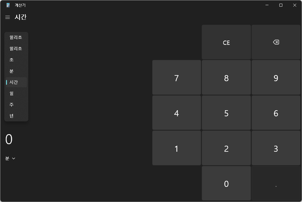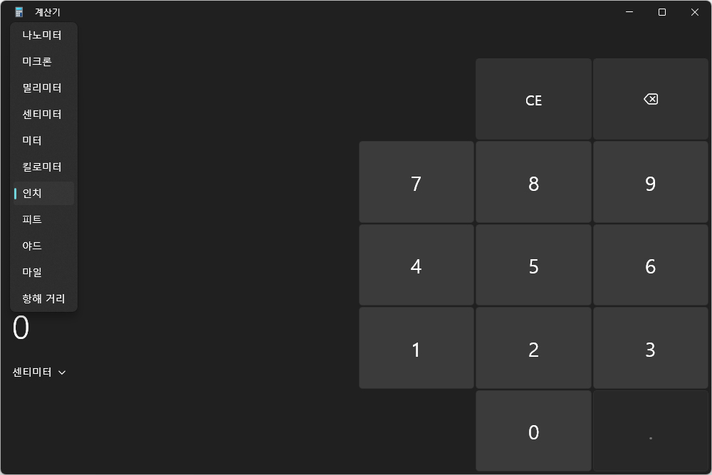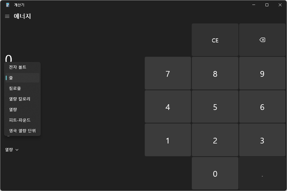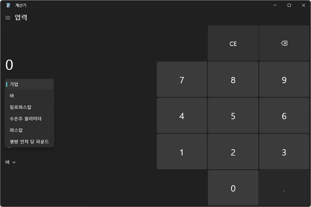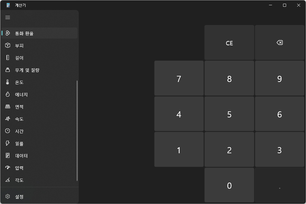 윈도우11 계산기의 편리한 기능 중의 하나는 변환기를 탑재했다는 점입니다. 환율과 부피, 길이, 무게 및 질량, 온도, 에너지, 면적, 속도, 시간, 일률, 데이터, 압력, 각도로 구성되어 있습니다.