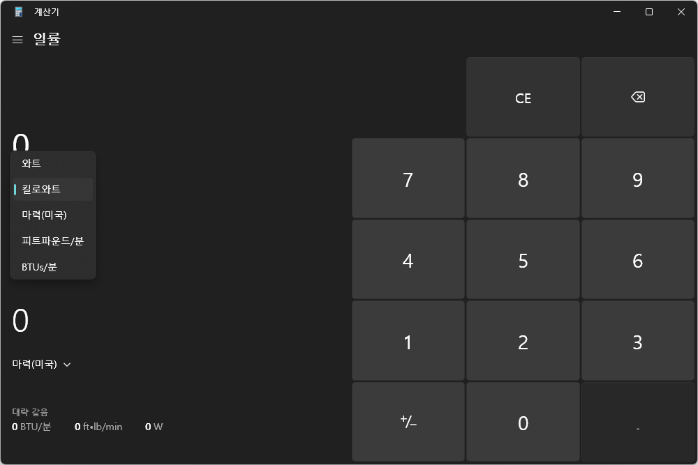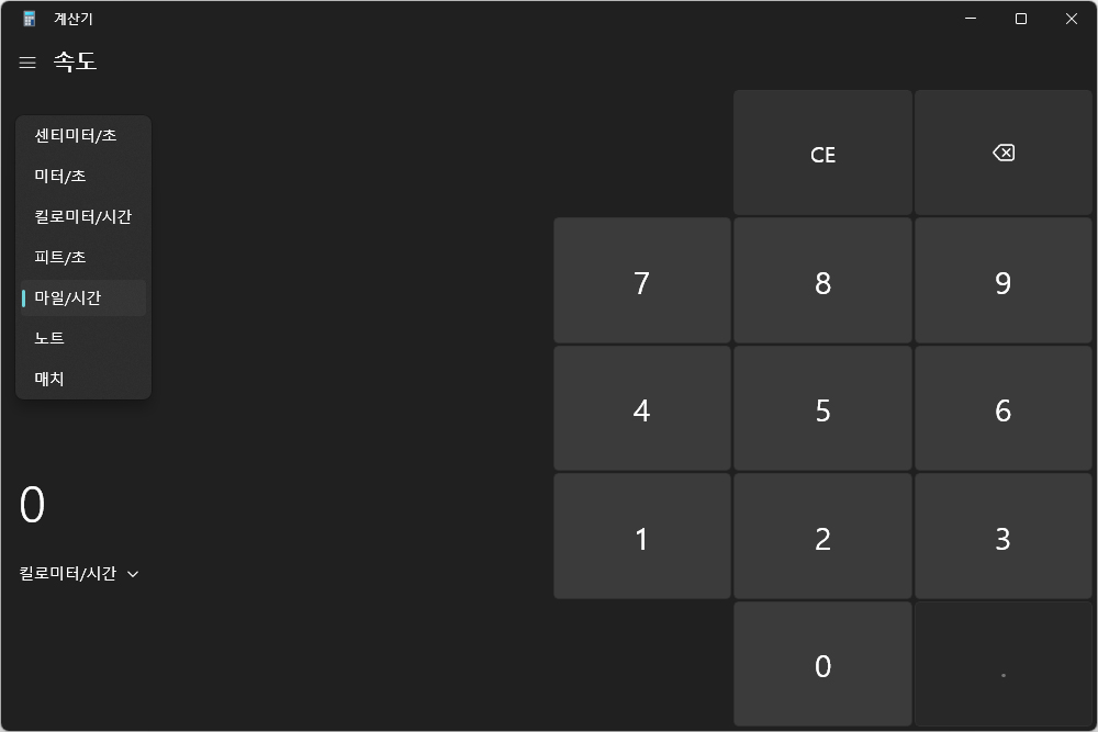 속도 역시도 미터를 피트나 마일로 변환하거나 시간을 변환할 수 있는 기능도 지원합니다. 그 외에도 일률을 변환할 수 있는 기능도 준비되어 있습니다. 필요에 따라서 활용해주는 것이 좋을 것 같습니다.