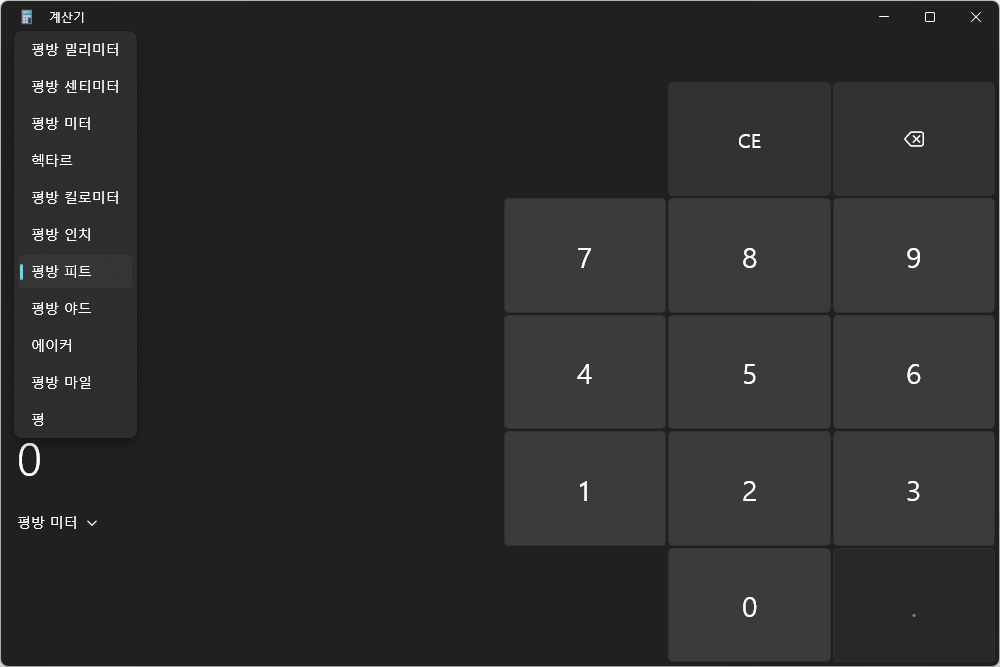 에너지에서는 줄이나 열량 칼로리를 변환할 수 있고 면적에서 국내에서 많이 사용되는 평을 평방 미터로 변환할 수 있습니다. 평이라는 단위가 너무 익숙해서 요즘 사용되는 제곱미터에 대한 감각이 조금 어색한 것 같습니다.