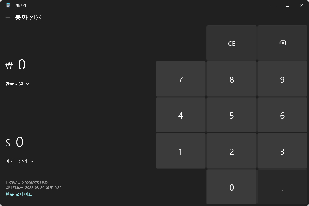 제가 윈도우11의 계산기 기능의 후기를 작성해야겠다고 생각했던 이유는 통화 환율을 계산할 수 있는 기능이 탑재되었기 때문입니다. 재미있는 부분은 달러와 유로를 물론이도 다양한 나라의 화폐를 지원하는 것은 물론이고 실시간으로 업데이트를 받을 수 있는 기능도 지원합니다.