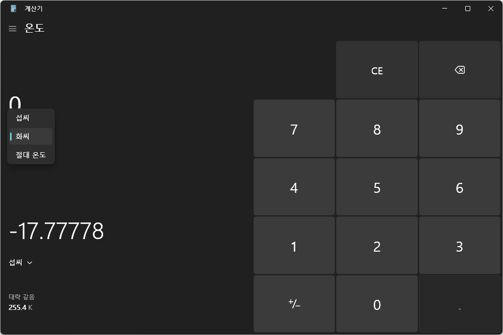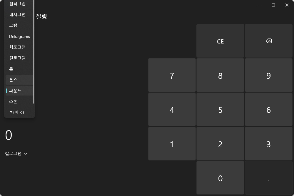 무게 및 질량은 그램을 온스나 파운드로 변환할 수 있고 온도는 섭씨와 화씨 절대 온도 등이 준비되어 있습니다. 여담이지만 온스나 파운드와 같은 단위들은 감도 잡히지 않는 느낌입니다.