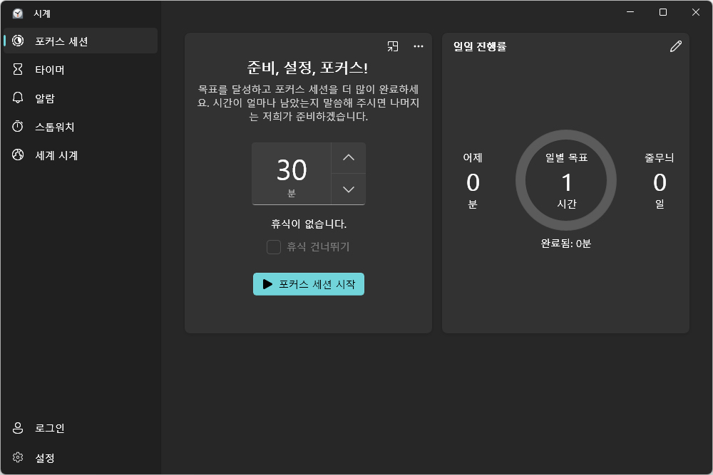 윈도우11 시계에는 포커스 세션이라는 기능이 추가되어 있습니다. 15분 단위로 시간을 추가해서 그 시간 동안 집중을 해서 공부를 하거나 기타 작업을 할 수 있도록 도와주는 역할을 합니다. 그리고 위에는 빠져있지만, TO DO 기능과 스포티파이를 연동할 수 있는 기능이 갖추어져 있습니다.