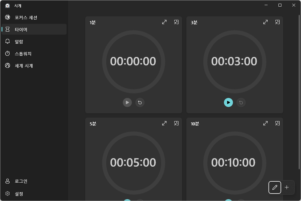 타이머는 1분, 3분, 5분, 10분 단위로 여러 개가 준비되어 있고 필요에 따라서 편집하거나 추가, 삭제를 할 수 있는 기능들을 지원합니다. 반복적인 작업을 할 때 유용합니다.