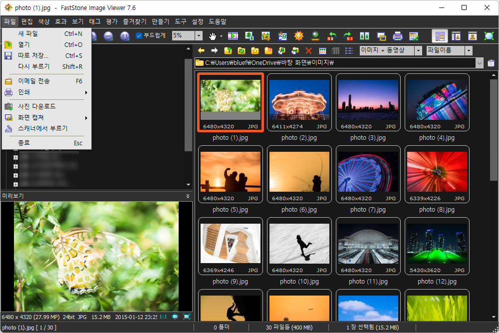 패스트스톤(FastStone) 이미지 뷰어의 기능들을 살펴보면 파일에서는 따로 저장하거나 다시 부르기와 같은 기능들이 준비되어 있습니다. 그리고 한국어를 완벽하게 지원하기 때문에 어렵지 않게 사용할 수 있습니다.