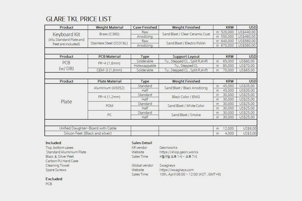 글레어(GLARE TKL 4th)는 2022년 4월 9일에 판매될 예정이고 그룹 바이(GB) 방식이기 때문에 주문을 받고 그때부터 생산을 시작하고 구매 수량에 따라서 다르겠지만 보통 6개월에서 1년 정도의 시간이 소요될 수 있습니다. 사실 커스텀 키보드에 관심 없는 분들이라면 조금은 어색할 수 있는 판매 방식과 어이없는 가격이라고 생각할 수 있습니다. 그렇지만 관련 취미를 가진 분들에게는 주목해야 할 제품이라고 판단되었습니다.