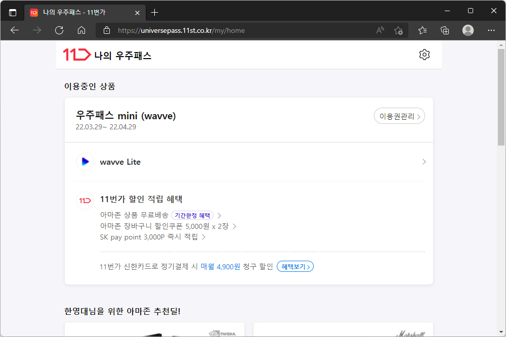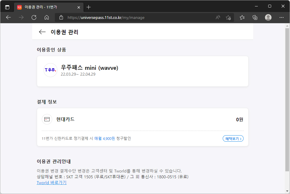 우주패스 미니를 선택하면 아마존 상품 무료배송이나 할인 쿠폰 그리고 SK pay pont에 대한 내용이 설명되어 있습니다. 그리고 11번가 신한카드로 정기결제를 하면 매월 4,900원 청구할인이 진행된다고 합니다. 참고로 이용권관리 메뉴로 해지를 할 수 있습니다.
