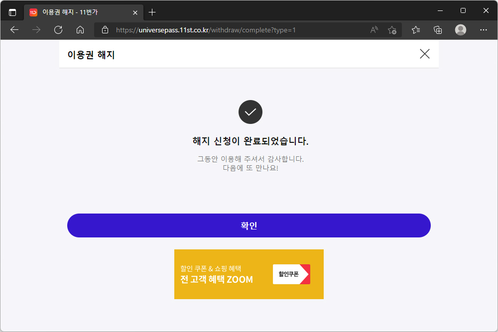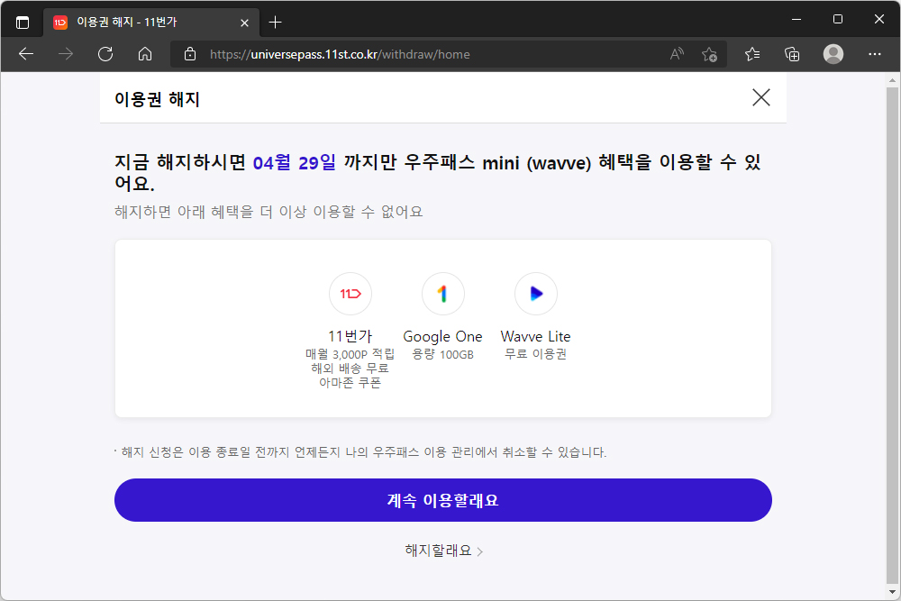 그리고 몇 번의 만류 과정을 거친 후에 이용권 해지하기를 선택하면 해지가 완료됩니다. 그리고 해지가 되었다고 해도 계약 기간의 혜택은 유지되고 자동결제 부분만 최소가 됩니다. 그래서 그대로 이용을 하면 됩니다.