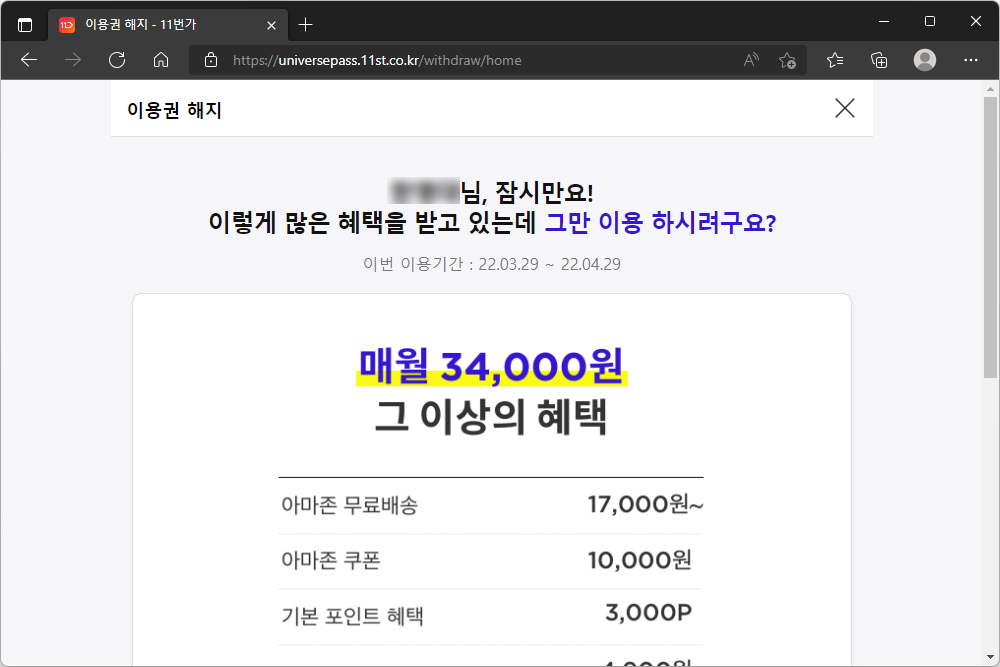 우주패스 미니를 선택하면 아마존 상품 무료배송이나 할인 쿠폰 그리고 SK pay pont에 대한 내용이 설명되어 있습니다. 그리고 11번가 신한카드로 정기결제를 하면 매월 4,900원 청구할인이 진행된다고 합니다. 참고로 이용권관리 메뉴로 해지를 할 수 있습니다.