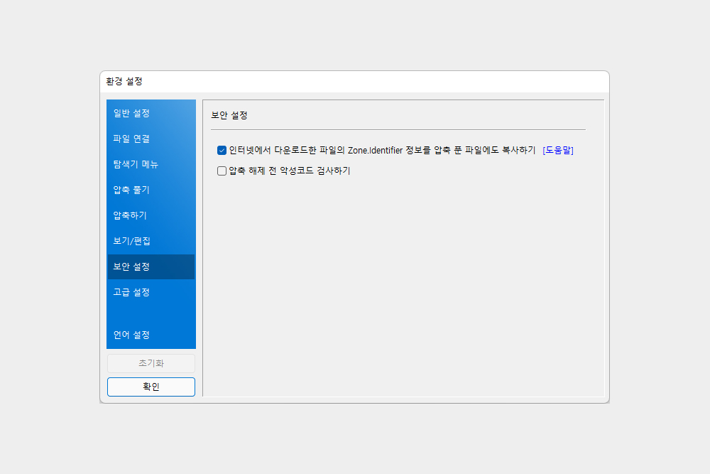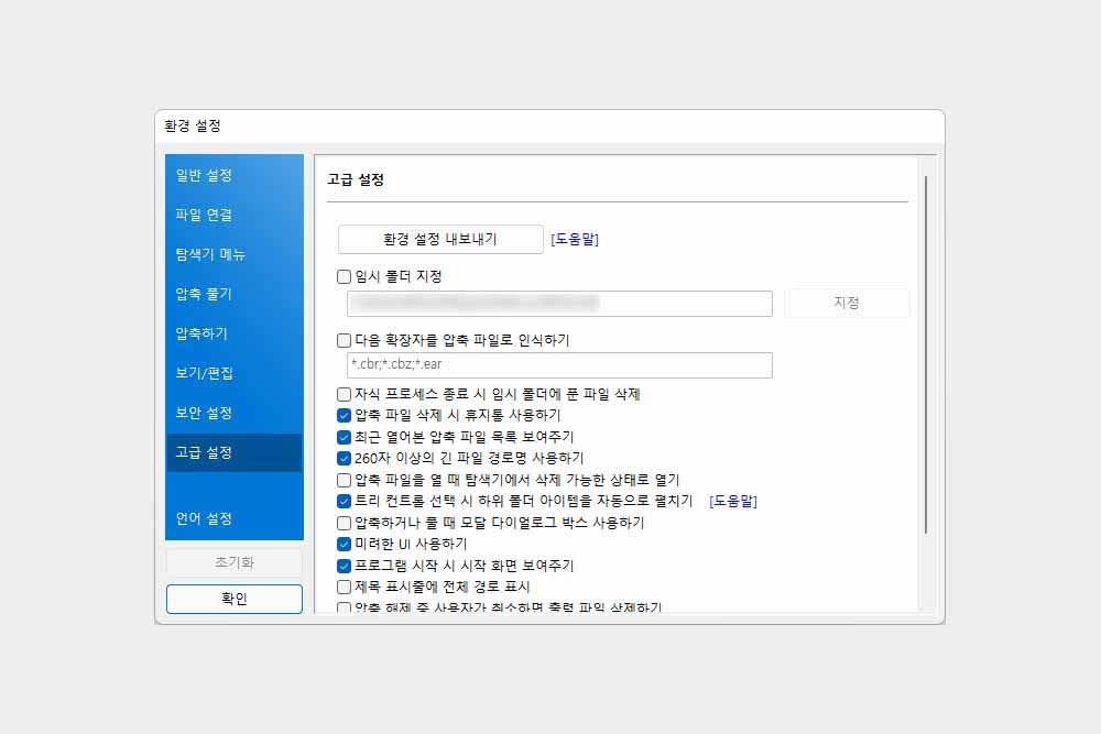 그리고 보안과 고급 설정과 같은 메뉴들도 준비되어 있습니다. 설정들이 상당히 다채로운 편이어서 자신의 취항에 맞게 반디집를 커스트마이즈해서 사용할 수 있다는 장점이 있습니다.