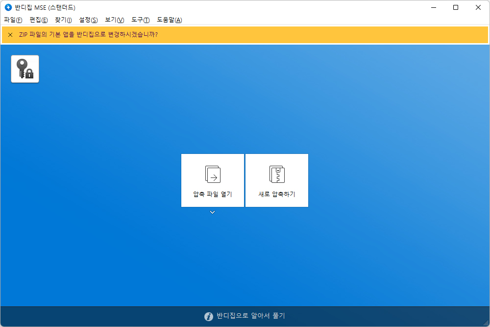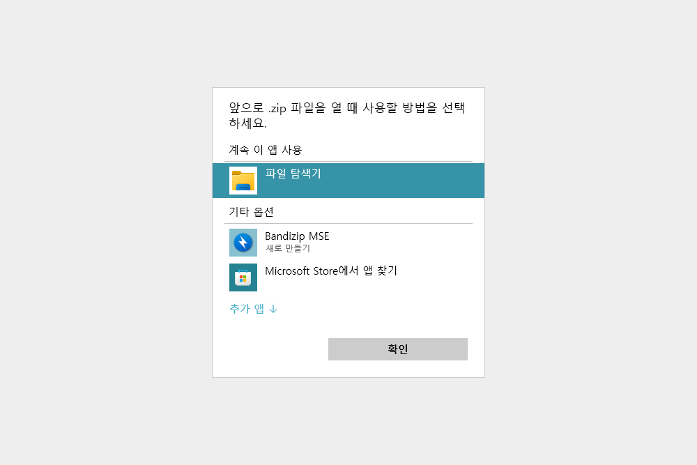 반디집를 다운로드 받아서 설치하면 위와 같이 ZIP 파일의 기본 앱을 반디집으로 변경하시겠습니까?라는 메시지가 출력됩니다. 이런 경우에는 .ZIP을 Bandizip MSE로 연결해 주면 됩니다.