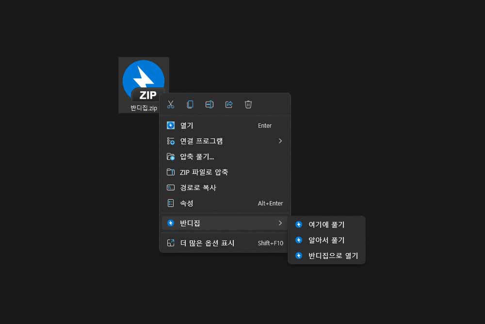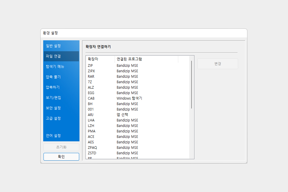 파일 연결에서는 ZIP이나 RAR, 7Z, ALZ, EGG, ARJ, ACE와 같은 파일들을 연결할 수 있습니다. 연결이 완료되면 해당 파일을 클릭했을 때 반디집이 실행됩니다.