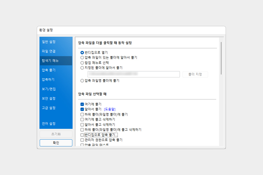 탐색기 메뉴에서는 해당 파일에서 마우스 오른쪽 버튼을 눌렀을 때 어떤 동작을 할 것인가를 지정할 수 있습니다. 저는 여기에 풀기와 알아서 풀기만 선택하는 편입니다. 특히 알아서 풀기의 활용도가 높은 편입니다,