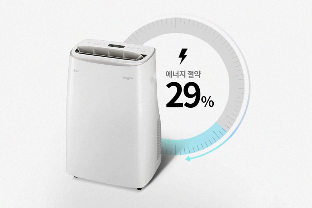 LG 휘센 이동식 에어컨 PQ08DCWAS에는 듀얼 인버터 컴프레서가 탑재되었고 에너지 효율이 뛰어나서 기존의 정속형 모델(LW-C062PEW)보다 최대 29%의 에너지를 절약할 수 있다고 합니다. 사실 최신 에어컨들은 전기세 걱정이 크지는 않은 편입니다.