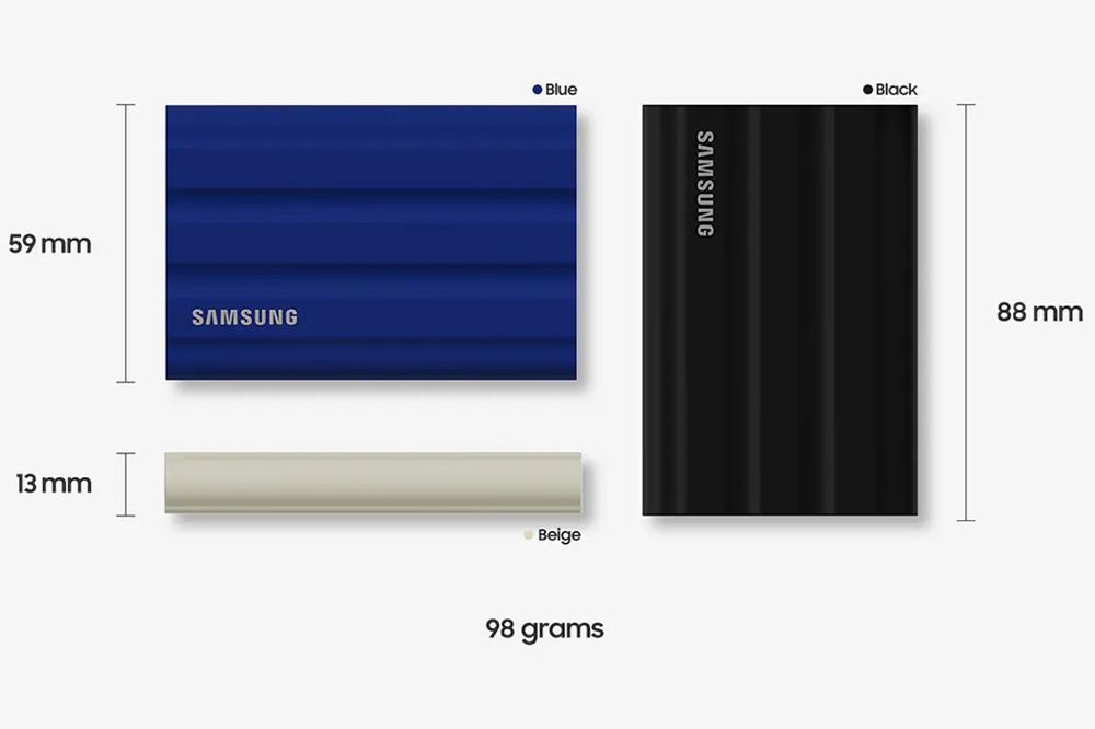 삼성 T7 실드(Shield)의 색상은 베이지, 블랙, 블루 3가지로 출시되었습니다. 그리고 크기가 상당히 콤팩트하고 무게도 가벼운 것을 확인할 수 있습니다. 외장 HDD와 비교해서 외장 SSD가 가질 수 있는 가장 큰 장점이라고 할 수 있습니다. 특히 움직이는 모터가 없어서 내구성은 비교할 수 없을 정도로 좋아졌습니다.