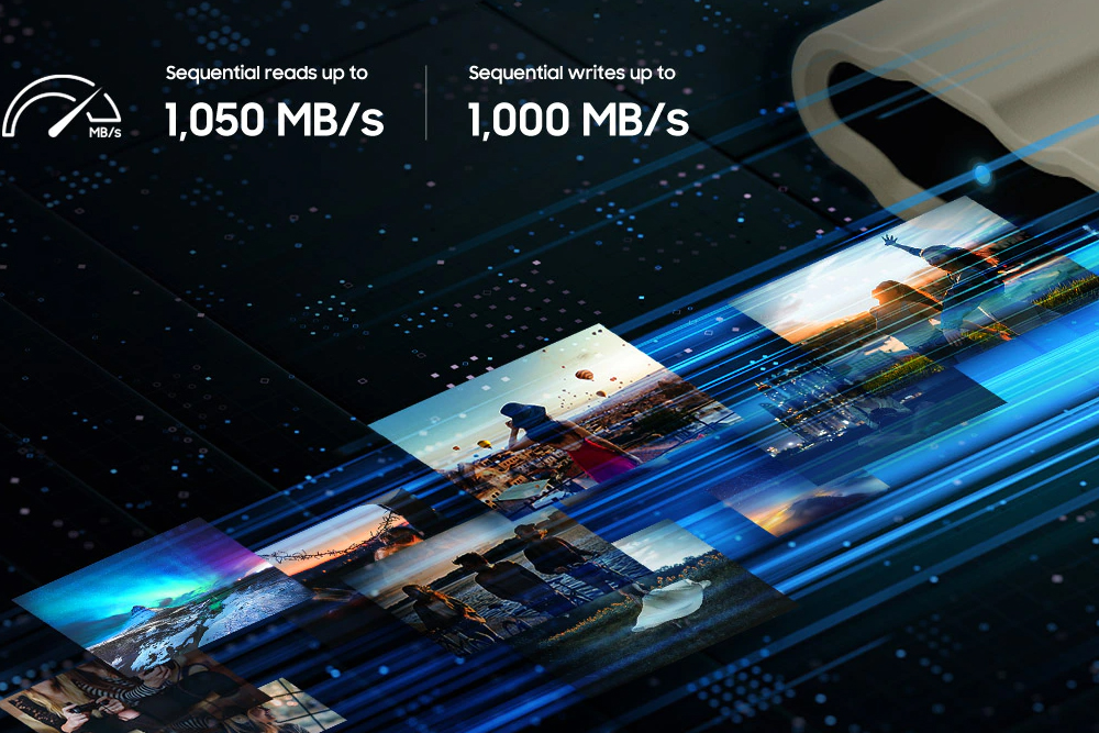 삼성 T7 실드(Shield)는 NVMe 방식의 SSD를 탑재했습니다. 그래서 1,050MB/s의 연속 읽기 속도와 최대 1,000MB/s의 연속 쓰기 속도를 제공합니다. 그 외에도 USB 3.2 Gen2 인터페이스를 지원합니다. 상당히 빠른 편이라고 할 수 있습니다.