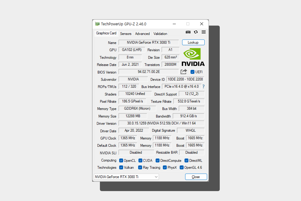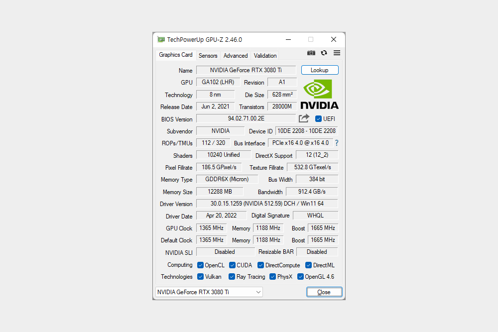 Advanced에서는 드라이버 버전이나 엔비디아 바이오스 그리고 Resizable BAR, 다이렉트11, 12, CUDA, VULKAN 등의 정보를 확인해 볼 수 있습니다. 역시 상당히 전문적인 내용이라고 할 수 있습니다.