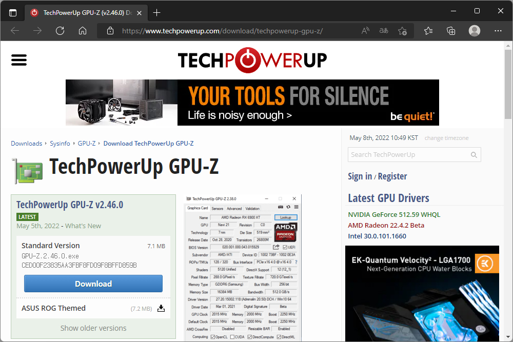 GPU-Z 프로그램은 아래의 링크에서 다운로드 받을 수 있습니다. 참고로 최신 버전은 포스팅이 작성된 2022년 5월 기준으로 V2.46.0입니다. 그리고 ASUS ROG THemed 버전도 다운로드받을 수 있습니다.