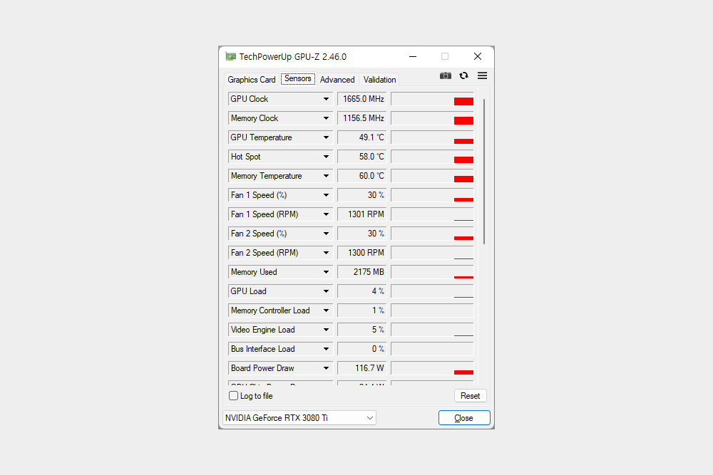 Sensors에서는 그래픽카드의 각종 클럭과 온도 등을 자세하게 확인해 볼 수 있습니다. 표시되는 정보의 종류가 상당히 다채로운 편이어서 활용도가 높을 것으로 예상합니다.
