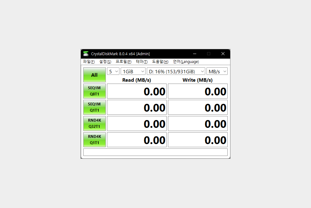 크리스탈 디스크 마크(CrystalDiskMark)는 심플한 스타일로 디자인되었고 상단에 배치된 메뉴를 이용해서 드라이버를 선택할 수 있습니다. 자신이 측정하기를 원하는 HDD나 SSD를 선택해주면 됩니다.