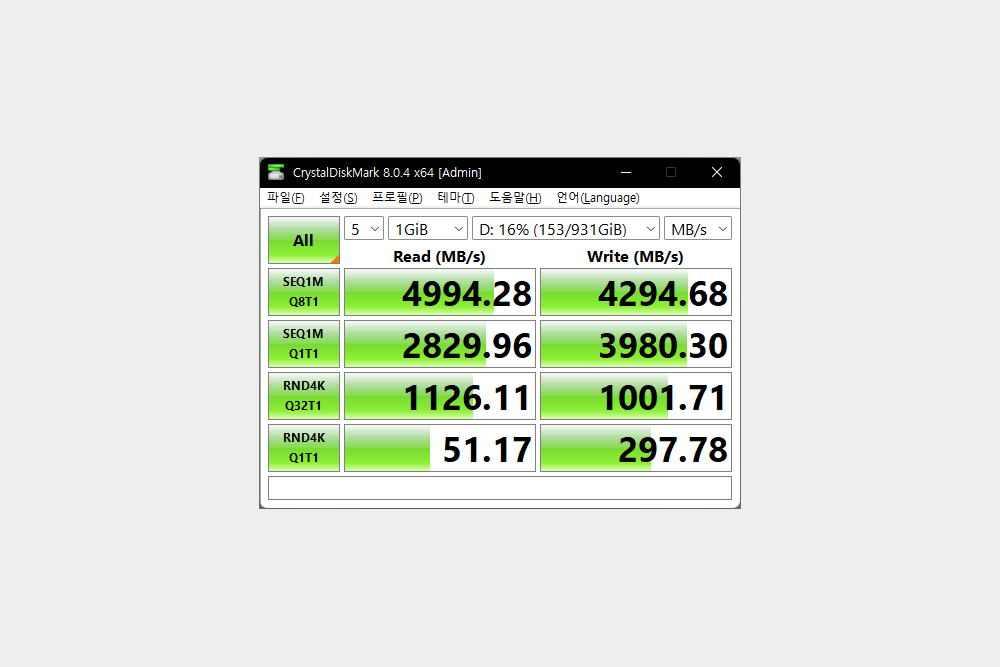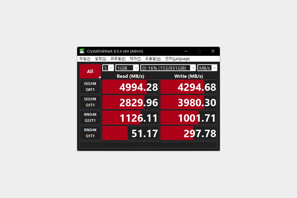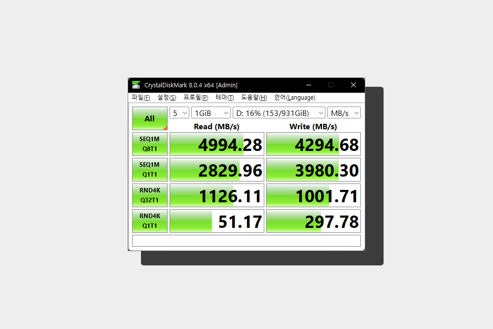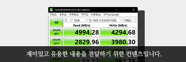 저는 PCIe 4.0을 지원하는 NVMe SSD로 속도 측정을 해서 SEQ1M Q8T1 순차 동시 읽기/쓰기 테스트가 3000MB/s를 넘어가는 것을 확인할 수 있습니다. 그리고 RND4K Q32T16는 랜덤 동시 읽기/쓰기 테스트이고 RND4K Q1T1는 랜덤 단일 읽기/쓰기 테스트입니다. 윈도우 환경에서는 순차적으로 데이터를 읽거나 쓰는 일이 많지 않기 때문에 랜덤 성능이 크게 중요합니다.