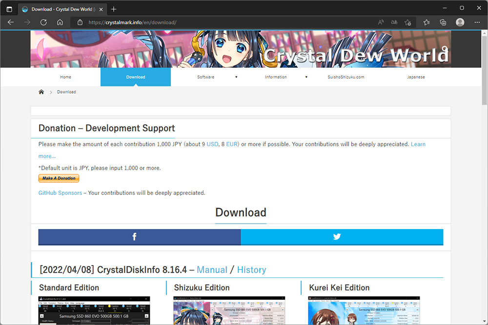 크리스탈 디스크 마크(CrystalDiskMark) 프로그램은 아래의 링크에서 다운로드를 받을 수 있습니다. 참고로 같은 개발자에 의해서크리스탈 디스크 인포(CrystalDiskInfo)도 개발되었습니다. 다음 번 포스팅에서 자세하게 확인해 보도록 하겠습니다.