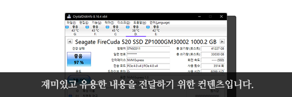 크리스탈 디스크 인포(CrystalDiskMark)에는 장착된 저장장치의 펌웨어 버전과 인터페이스 그리고 총 읽기량과 쓰기량, 사용 횟수, 사용 시간 등을 확인해 볼 수 있습니다. 만약 SSD를 중고 거래하려고 할 때 활용하면 좋을 것 같습니다.