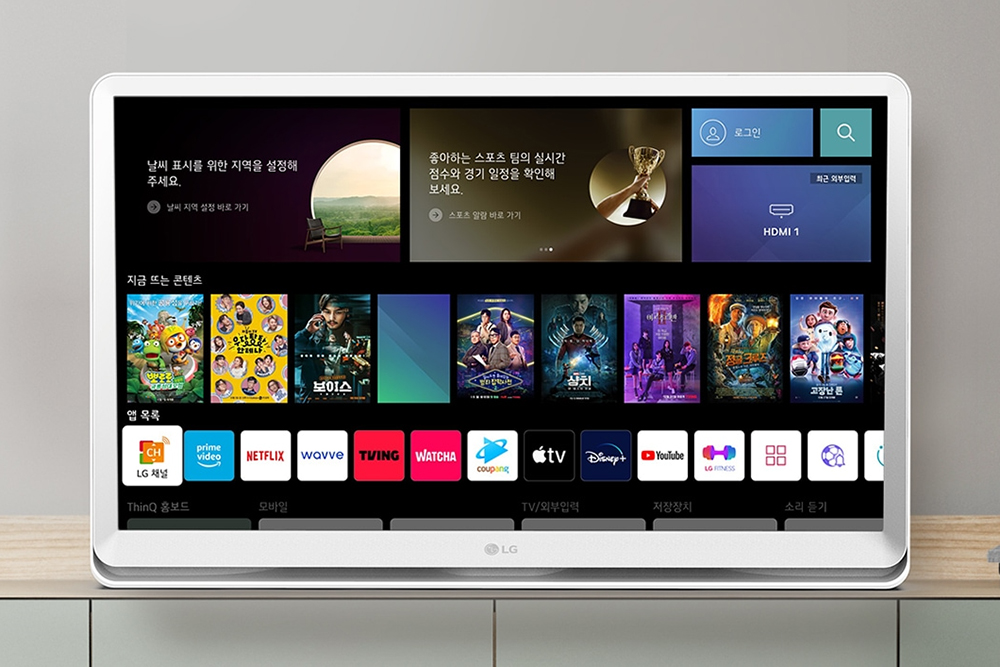 LG 룸앤TV 27TQ600SW에는 새롭게 업그레이드된 webOS22가 탑재되었습니다. 일종의 스마트 TV라고 할 수 있고 유튜브는 물론이고 넷플릭스나 디즈니 플러스와 같은 OTT 서비스들도 별도의 셋톱박스 없이 재생할 수 있습니다. 은근히 편리한 기능 중의 하나입니다.