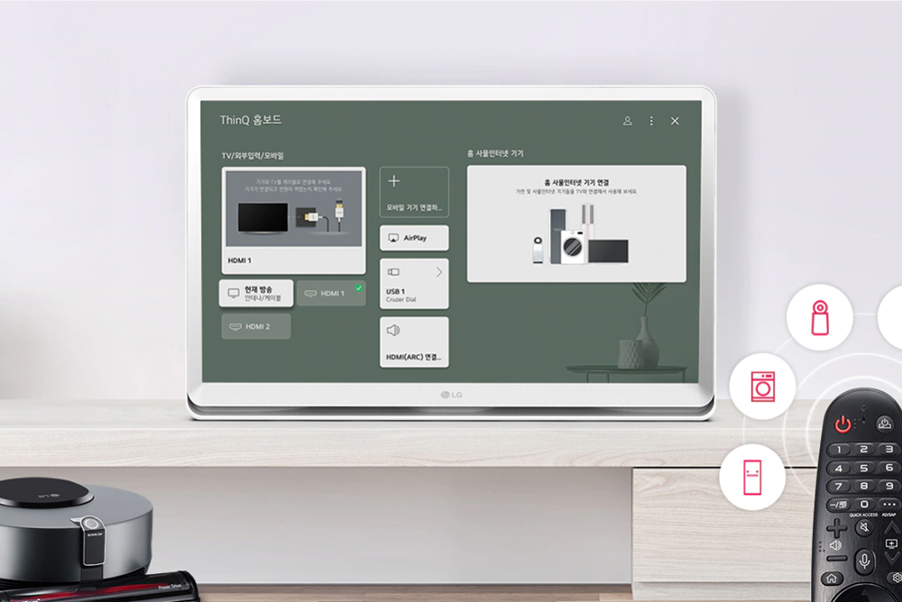 LG 룸앤TV 27TQ600SW에는 인공지능 홈보드라는 기능이 탑재되었습니다. LG전자에서 출시되는 다양한 종류의 스마트 가전제품들을 제어할 수 있는 것은 물론이고 일부 IoT 제품들도 조절할 수 있습니다.