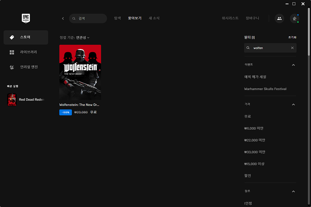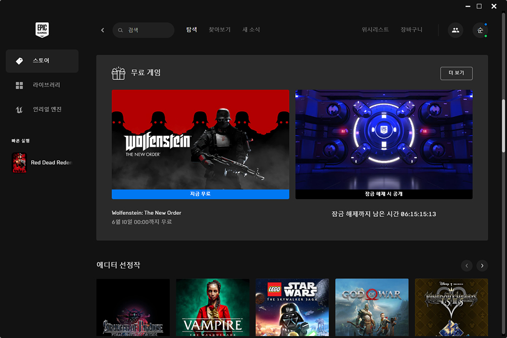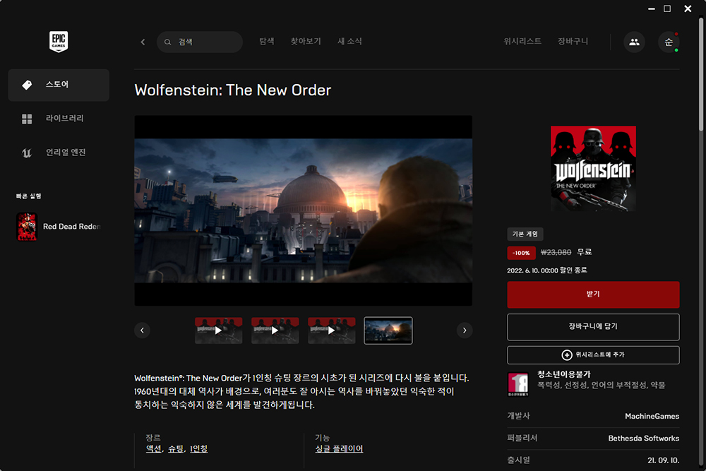 에픽게임즈 런처의 중간을 확인해 보면 울펜슈타인: 더 뉴 오더(Wolfenstein: THE NEW ORDER)가 무료 게임 메뉴에 준비된 것을 확인할 수 있습니다. 기간은 일주일으로 넉넉한 편이고 다음 주에도 대작에 배포됩니다.