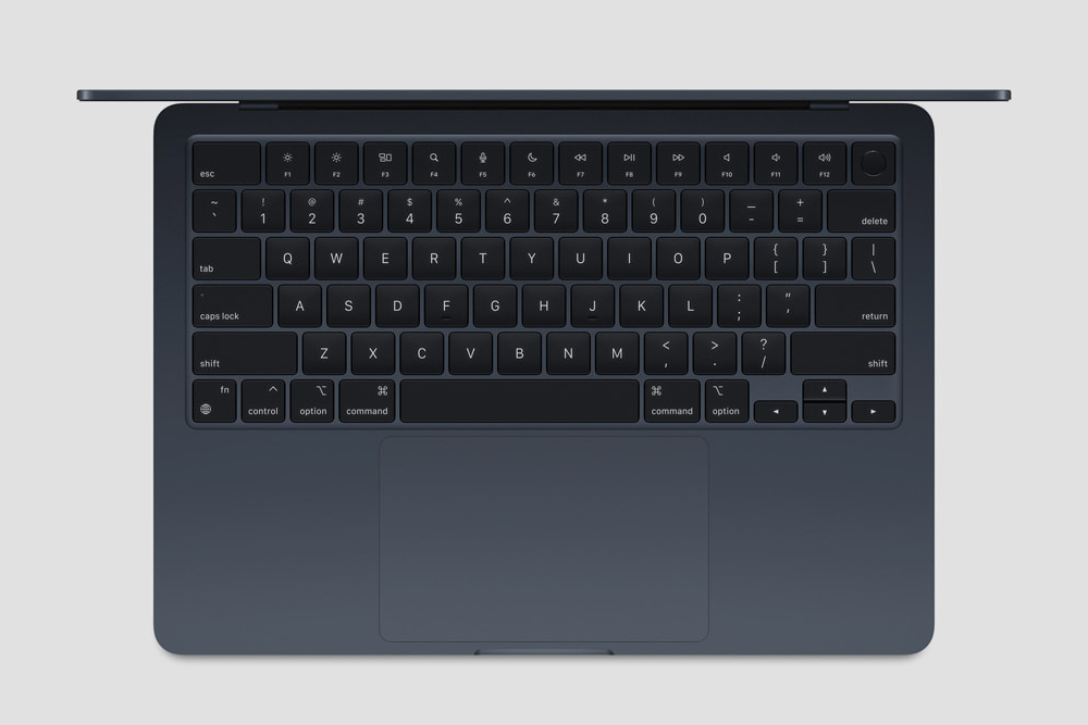 맥북에어 M2에는 백라이트 Magic Keyboard가 탑재되었습니다. 풀사이즈 기능키 12개와 T자 배열의 뱡항키를 포함한 78키로 구성되어 있습니다. 그리고 터치 아이디(Touch ID)와 주변광 센서 그리고 Force Touch 트랙패드 등을 지원합니다.