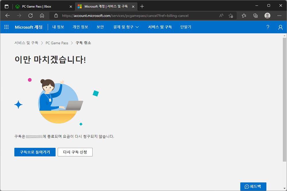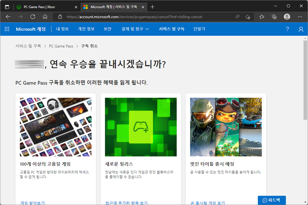 구독 취소가 완료되고 만약 엑스박스 게임패스 서비스가 마음에 드는 분들은 다시 구속 신청 메뉴를 통해서 바로 다시 구독을 할 수 있습니다. 사실 서비스 자체는 나무랄 데가 없습니다.