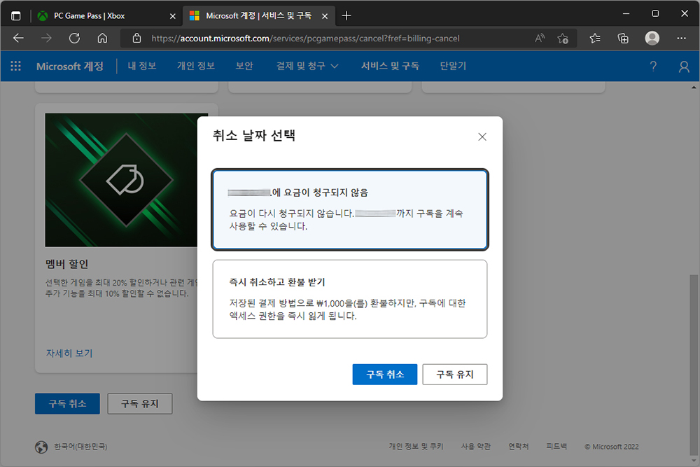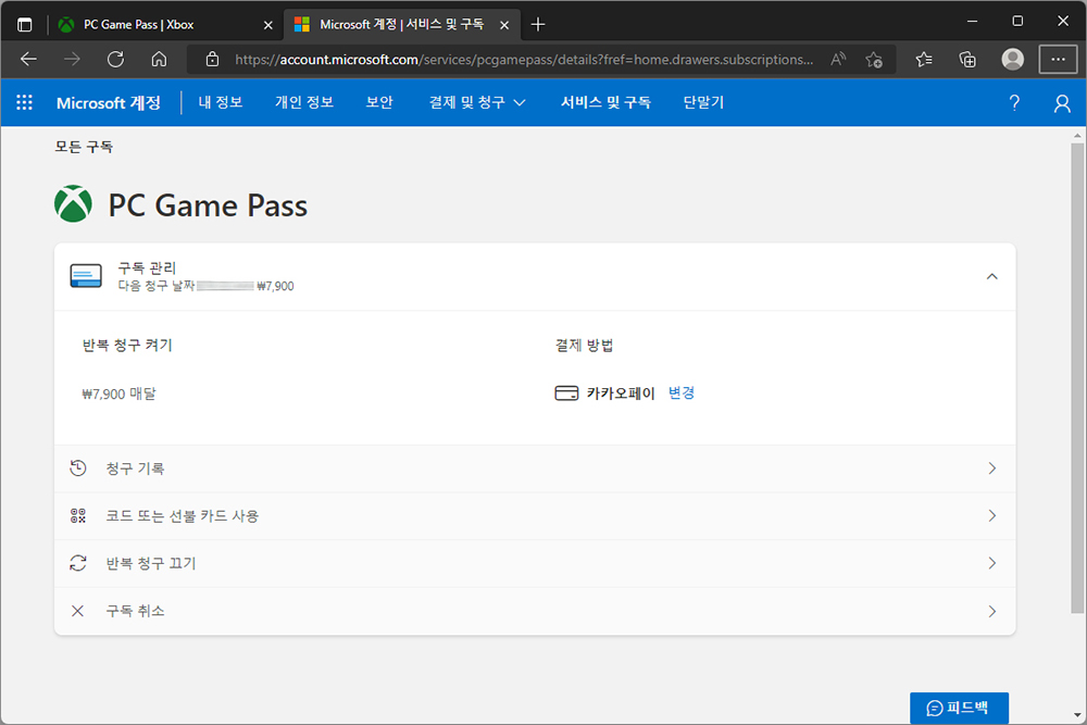 결제가 완료되면 이제는 해지 방법을 확인해 보도록 하겠습니다. 엑스박스 홈페이지의 서비스 및 구독 항목을 확인해 보면 다음 청구 날짜와 가격을 확인할 수 있습니다. 그리고 맨 아래쪽에 구독 취소 관련 메뉴가 준비되어 있습니다.
