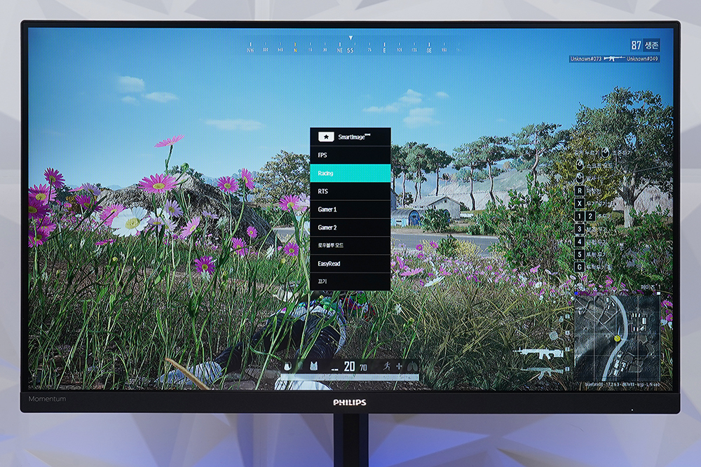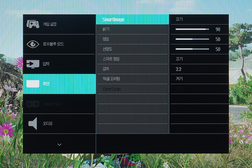 화면에서는 밝기나 명암 그리고 선명도 등을 조절할 수 있습니다. 그리고 스마트 이미지(SmartImage) 기능을 이용해서 자신이 플레이하고 있는 게임이나 감상하는 콘텐츠에 맞게 변경할 수 있는 기능도 제공합니다.